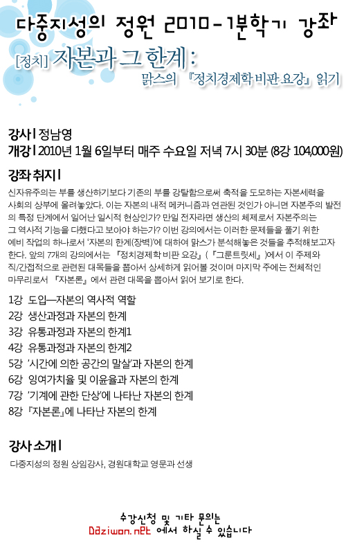 2010 1분학기 다지원강좌 <자본과 그 한계 : 맑스 정치경제학비판요강 읽기> 2010년 1월 3일 | 예전자료-열린마당 안녕하세요, 서울 마포구 서교동에 위치한 강좌공간 다중지성의 정원입니다. 다지원에서는 이번주 수요일(2010.1.6)부터 [자본과 그 한계 : 맑스의 『정치경제학 비판 요강』 읽기] 강좌를 마련하였습니다. 위기의 시대, 우리 시대 변혁의 전망을 함께 고민 해 보았으면 합니다. 많은 관심 부탁드립니다. 감사합니다. ^^ 이미지를 클릭하시면 다양한 다지원 강좌를 만날 수 있습니다! Facebook Twitter