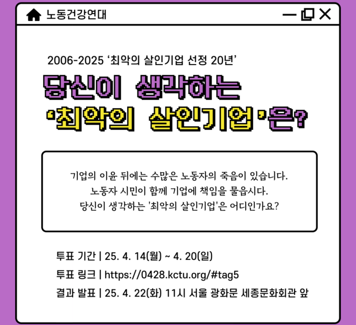 더 많은 노동자, 시민과 함께 기업의 책임을 촉구하기 위하여 구독자님이 생각하는 ‘최악의 살인기업’에 투표해주세요!