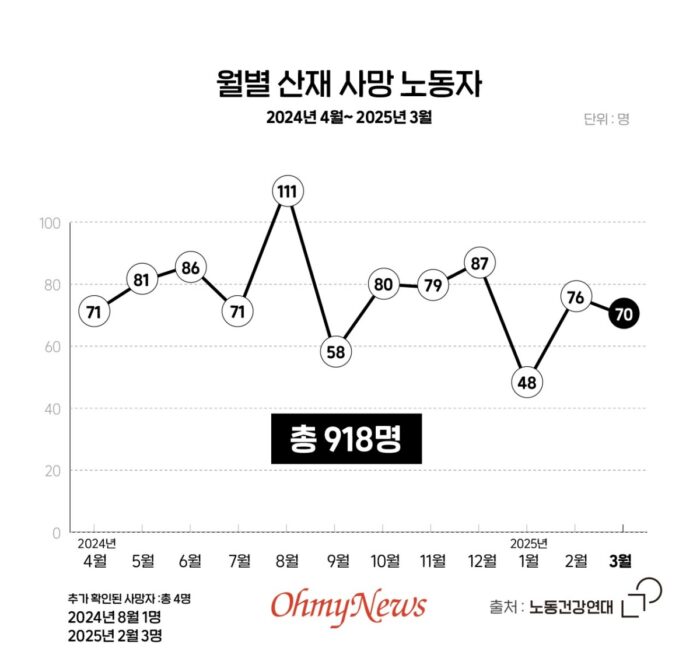 2025년 3월, 일하다 목숨을 잃은 노동자 70명의 명복을 빈다.