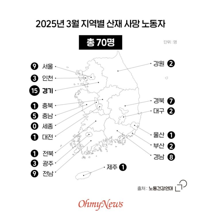 ▲ 2025년 3월 지역별 산재 사망 노동자 ⓒ이은영