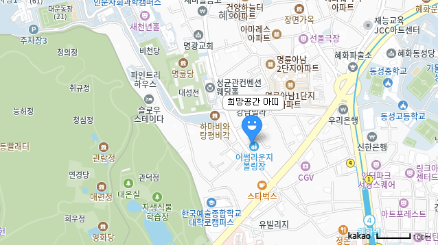 오시는 길 로드뷰길찾기지도 크게 보기 주소(03074) 서울시 종로구 성균관로 12 유니지오 5층 희망공간 아띠 지하철: 혜화역 4번 출구 도보 10분 버스: 명륜3가.성대입구(중) 정류장 도보 5분