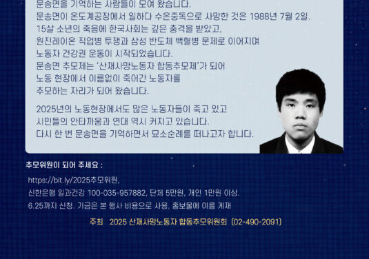 2025 산재사망노동자 합동추모제·묘소 순례 이름 없는 ‘문송면들’을 기억하며 함께 걸어요 2025.06.29(일) 10:30~12:30 ...